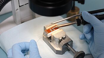 Standard contacts for piezo actuators are 100 mm stranded wires or soldering points. For each piezo element, different wires acc. to the AWG standard are used. Please observe the soldering instructions for each product.