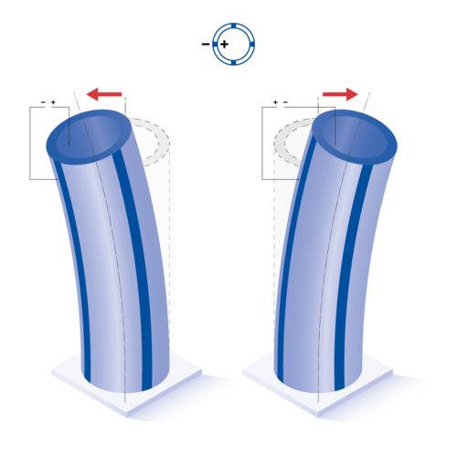 | Polarization direction | Depending on the contacting and attachment of the electrodes, different bending occur in the axial, radial and lateral directions. For more information see >> Operating Modes. |