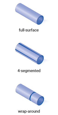 | Electrode designs | In addition to multi-segmented tubes, other designs are possible, such as full-surface, 4‑segmented or wrap‑around. See rigth column. |